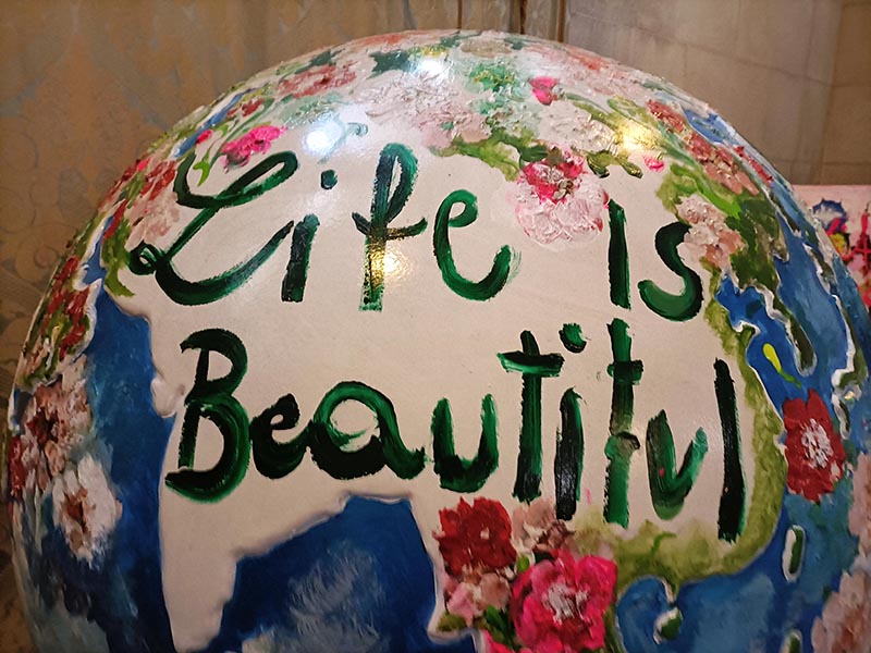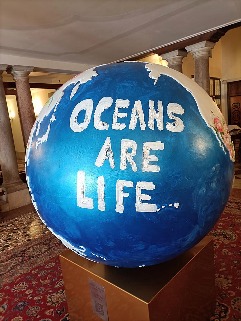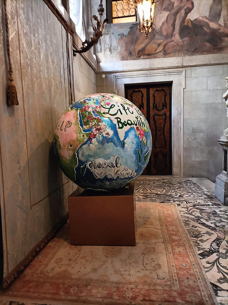 At Ca’ Sagredo Hotel there are some very interesting works by the artist Paola Buratto Caovilla . They are visible on the ground floor and on the mezzanine. They are globes, with writings about global warming, and the problems our planet suffers from.