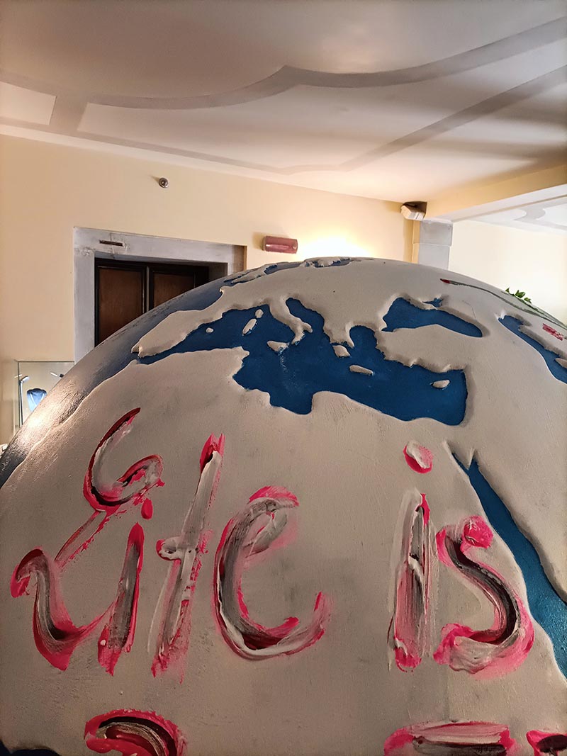 Sono con questi messaggi che l’artista vuole dare al resto del mondo, e quale modo migliore per diffondere il messaggio del hotel Ca’ Sagredo ? Ca’ Sagredo è uno dei migliori alberghi di Venezia, e le posizioni strategiche dei mappamondi, sono perfettamente visibili a tutti i turisti che entrano, escono dall’albergo, in tutti i loro giorni della loro permanenza.