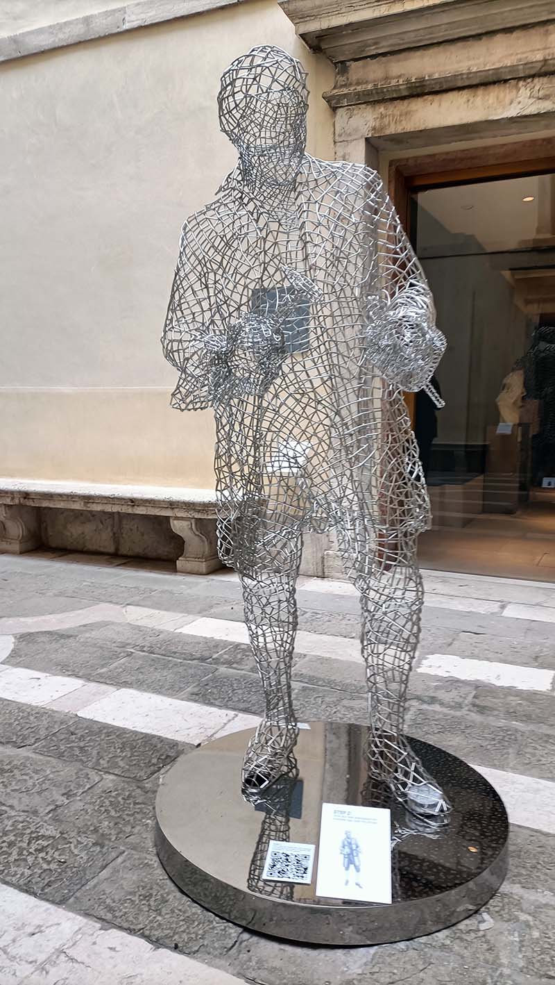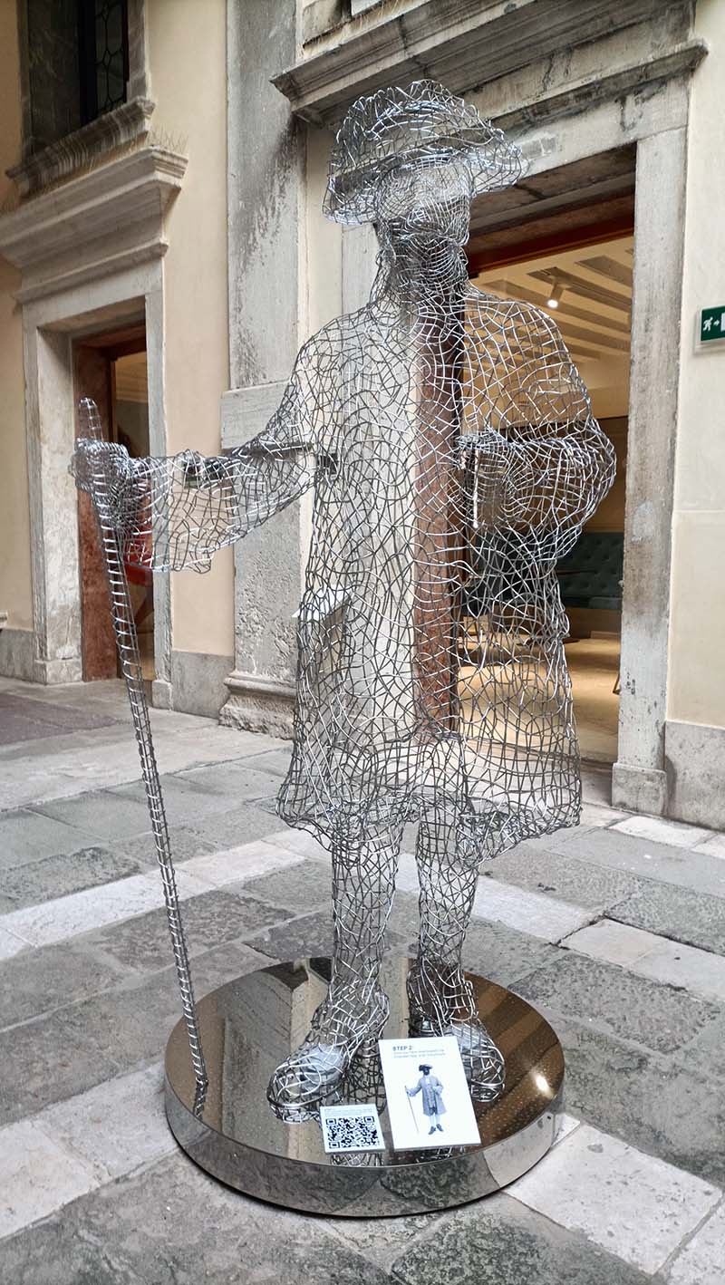 This exhibition is made up of 15 mesh statues, distributed on the ground floor in the museum’s entrance hall. These works symbolize the important characters who have shaped the history of the Serenissima over the centuries, consolidating the inseparable link between the city and its various artistic expressions, immortalized forever by Venetian creators. Among these historical figures we find: