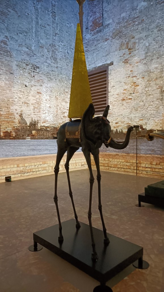 Poi arrivano le sue opere più celebri, animate, trasformate, vive. Gli orologi molli di Dance of Time colano davanti agli occhi, ricordandoci che per Dalí il tempo non è mai stato una certezza ma qualcosa di elastico, personale, quasi emotivo. Gli elefanti slanciati e impossibili di The Triumphant Elephant avanzano con le loro zampe sottilissime, simboli di forza e fragilità che convivono nello stesso corpo. Adam & Eve riporta il tema dell’origine, del desiderio e della colpa, mentre Lady Godiva scivola nello spazio con quella sensualità sospesa, tipica dell’artista. E poi le api, onnipresenti, piccole ma disturbanti, metafora del subconscio, del sogno che punge.
