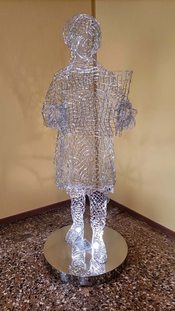 This exhibition is made up of 15 mesh statues, distributed on the ground floor in the museum’s entrance hall. These works symbolize the important characters who have shaped the history of the Serenissima over the centuries, consolidating the inseparable link between the city and its various artistic expressions, immortalized forever by Venetian creators. Among these historical figures we find: