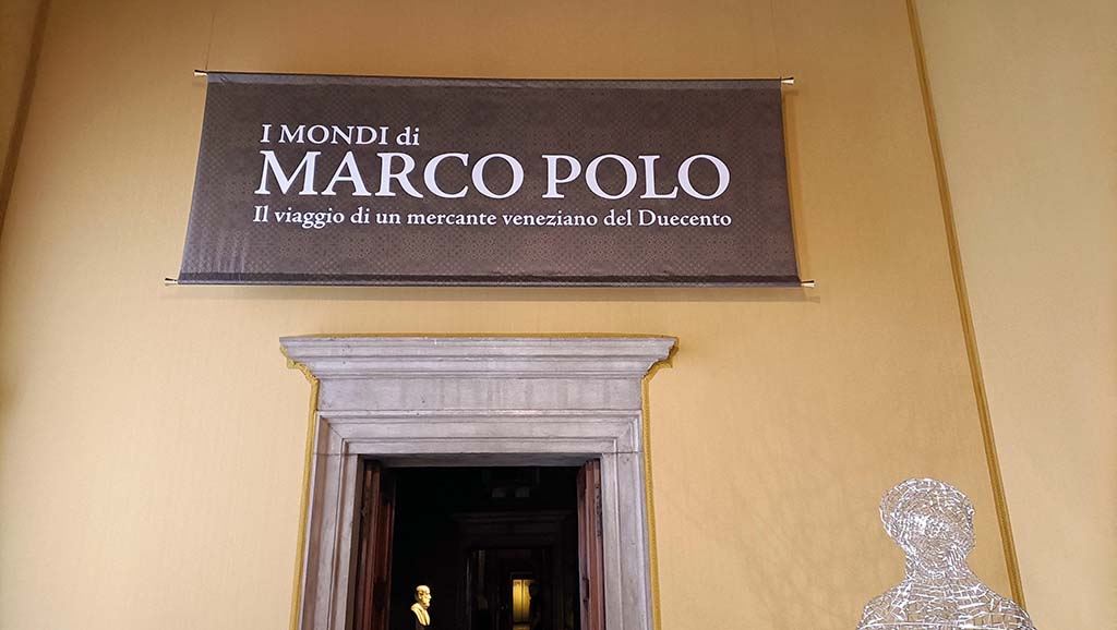 La mostra copre circa 10 sale, ognuna con una specifica area relativa a Marco Polo: Armenia, Mongolia, Iran, Cina, India, Korean ect. dove possiamo trovare di tutto, dalle mappe dove ci mostra tutte le sue tappe, e non solo; mappe originali dell’epoca, come il mappamondo borgiano, un planisfero di Tolomeo II, un astrolabio, il testamento redatto dal notaio Giovanni Giustinian, ceramiche, bassorilievi, manoscritti originali, vangeli, bibbie del 12/13 secolo, libri in lingua francese del milione, monete, tessuti e molto altro ancora.