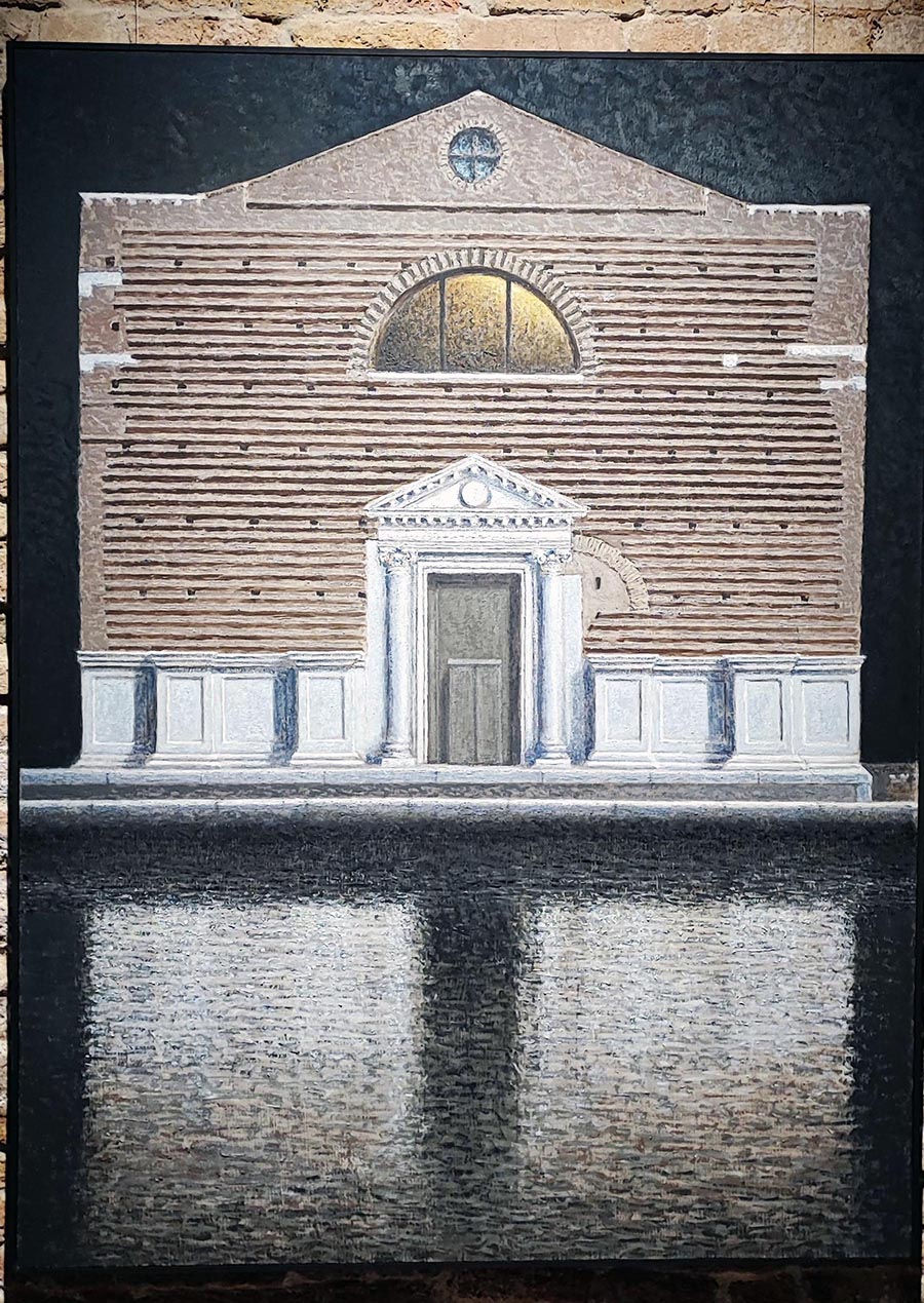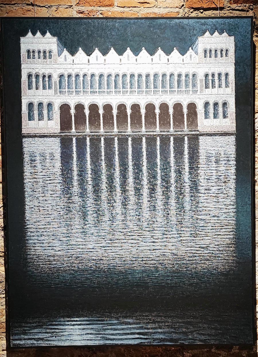The subjects of this series of paintings include ten emblematic buildings overlooking the Grand Canal, from the Dogana da Mar to the Church of San Simeone, each of which aroused a particular interest for Soccol, resulting in formal dialogue and spirituality. The canvases, more or less 200 cm high and 150 cm wide, were painted with mixed techniques, i.e. thin tempera, water-in-oil emulsion, oleoresin enamel, all prepared by the artist directly in the studio, following research on historical methodologies traditional.